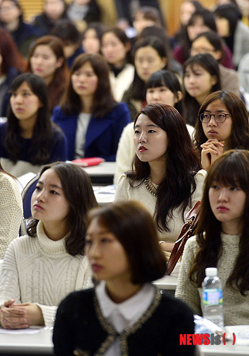 【서울=뉴시스】최동준 기자 = 24일 오후 서울 용산구 숙명여자대학교 백주년기념관 삼성컨벤션센터에서 열린 정시모집 합격생 대상 홍보 프로그램인 '숙명, 너는 내숙명-여대라서 더 좋아'에서 신입생들이 대학생활 설명을 듣고 있다. 2014.01.24.