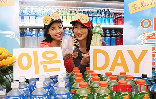 【서울=뉴시스】4일 오전 서울 이마트 용산점에서 모델들이 이온데이 행사제품을 선보이고 있다. 이마트는 이온음료와 발음이 유사한 2월 5일을 이온데이로 지정해 주요 인기 이온음료를 반값에 판매하는 판촉행사를 오는 6일까지 진행한다. 2014.02.04. (사진=이마트 제공)