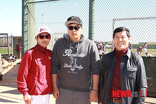 【서울=뉴시스】LA다저스 류현진(가운데)이 9일(현지시각) 미국 애리조나 서프라이즈에 위치한 넥센히어로즈 스프링캠프지를 방문해 염경엽(왼쪽) 넥센히어로즈 감독, 허구연 해설위원과 기념촬영을 하고 있다. 2014.02.10. (사진=넥센히어로즈 제공)