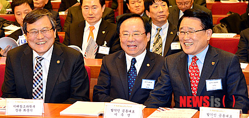 【서울=뉴시스】박동욱 기자 = 14일 오후 서울 여의도 국회 헌정기념관에서 열린 '코리아 베스트 오브 더 베스트 시큐리티 포럼(Korea Best of Best Security Forum), 정보보호산업의 육성과 인재양성 창립 총회 및 기념 세미나'에서 최문기(왼쪽부터) 미래창조과학부 장관, 해양수산부 장관으로 내정된 새누리당 이주영 의원, 유준상 한국정보기술연구원장이 대화를 나누고 있다. 2014.02.14.