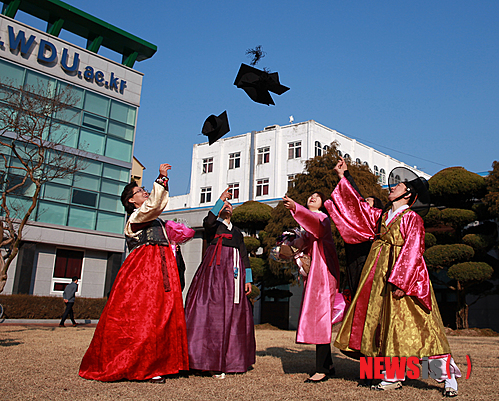 【서울=뉴시스】원광디지털대학교(총장 성시종, www.wdu.ac.kr)는 지난 15일(토) 전라북도 익산의 원광대학교 학생회관 대강당에서 2013학년도 전기 학위수여식을 개최했다. 사진은 학사모 던지며 졸업을 자축하는 한국복식과학학과 졸업생들.