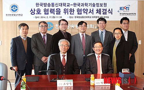 【서울=뉴시스】한국방송통신대학교 조남철 총장과 한국과학기술정보연구원 박영서 원장이 17일 오전 서울 종로구 대학로 방송통신대 본관 회의실에서 '사이버 러닝 기반의 원격 고등교육' 협약을 체결한 뒤 참석자들과 기념촬영을 하고 있다. 2014.02.17. (사진=한국방송통신대학교 제공)