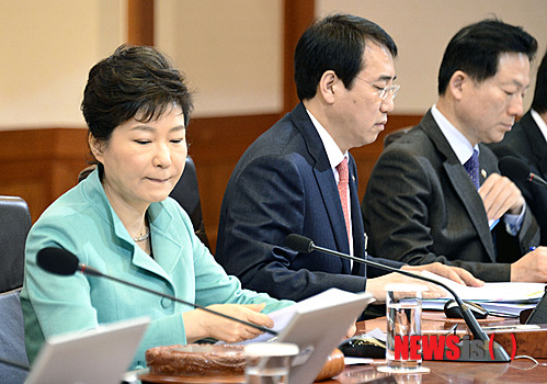 【서울=뉴시스】홍찬선 기자 = 박근혜 대통령이 18일 오전 청와대에서 제9회 국무회의를 주재하며 경주 마우나오션 리조트 붕괴 사고와 관련해 유감표명을 한 후 서류를 보고 있다. 2014.02.18.