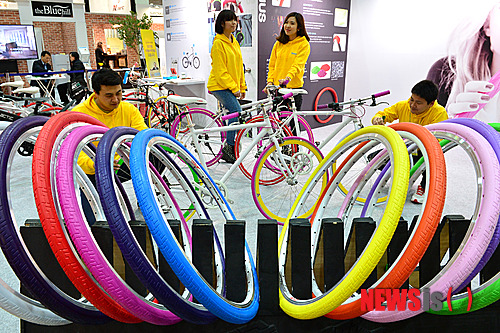 【서울=뉴시스】조종원 기자 = 20일 오전 서울 강남구 코엑스에서 열린 2014 서울국제스포츠레저산업전 화인케미칼 부스에서 관계자들이 노펑크 자전거 타이어 타누스를 선보이고 있다. 2014.02.20.