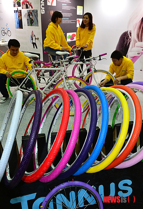 【서울=뉴시스】조종원 기자 = 20일 오전 서울 강남구 코엑스에서 열린 2014 서울국제스포츠레저산업전 화인케미칼 부스에서 관계자들이 노펑크 자전거 타이어 타누스를 선보이고 있다. 2014.02.20.