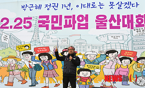 【울산=뉴시스】장지승 기자 = 25일 오후 4시께부터 울산 남구 태화강역 광장에서 박근혜 정권 퇴진과 민주주의 탄압 저지, 민영화 저지, 민주노총 탄압 중단 등을 요구하는 국민파업 울산대회가 열리고 있다. 2014.02.25.