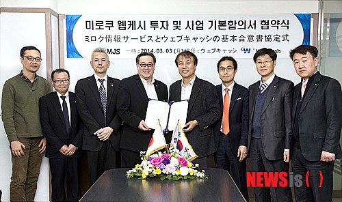 【서울=뉴시스】국내 비즈니스 소프트웨어 기업 웹케시(대표 윤완수, www.webcash.co.kr)는 3일 일본 대표 세무 소프트웨어 기업 MJS와 사업협력을 위한 기본합의서를 체결했다고 밝혔다. 코레다 히로키 MJS 대표와 석창규 웹케시 대표 및 참석자들이 기념촬영을 하고 있다. 2014.03.03. (사진=웹케시 제공)