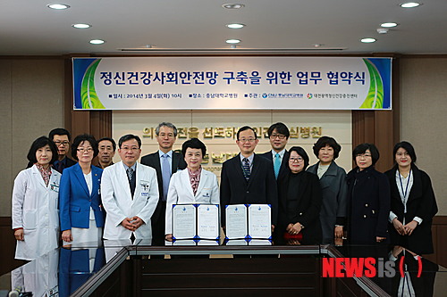 【대전=뉴시스】이시우 기자 = 충남대학병원(원장 김봉옥)은 4일 행정동 3층 세미나실에서 대전광역정신건강증진센터(센터장 유제춘)와 업무 협약을 맺고 정신건강 증진을 위한 정보공유와 상호 협력을 약속했다. 2014.3.4. (사진=충남대학병원 제공)