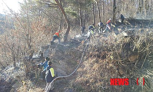 【춘천=뉴시스】박혜미 기자 = 5일 오후 3시7분께 강원 춘천시 사북면의 야산에서 산불이 발생해 임야 160㎡가량을 태우고 약 1시간20여분만인 4시23분께 진화됐다. 2014.03.05. (사진=춘천소방서 제공)