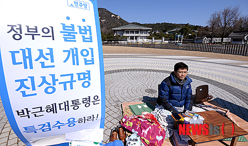 【서울=뉴시스】서재훈 기자 = 9일 오전 서울 청와대 분수대 앞에서 김광진 민주당 의원이 '국정원 등 국가기관 불법 대선개입 진상규명 특검 촉구를 위한 청와대 릴레이 농성'을 벌이고 있다.