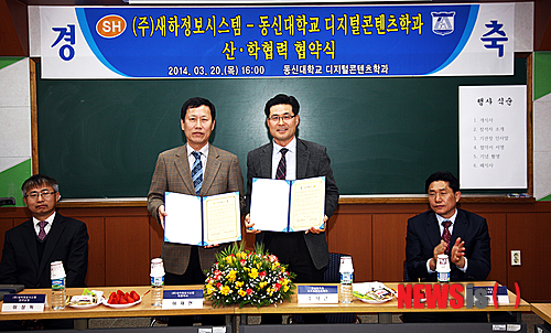【나주=뉴시스】이창우 기자 = 21일 동신대학교에 따르면 국내 굴지의 응용소프트웨어 개발 기업인 ㈜새하정보시스템이 디지털콘텐츠학과와 산학교류협약을 체결하고 IT분야 인재양성에 써달라며 장학금 1000만원을 기부해왔다고 밝혔다. 사진은 장학금 전달하는 새하정보시스템 이재현 (왼쪽)대표이사 2014.03.21 (사진=동신대학교 제공)