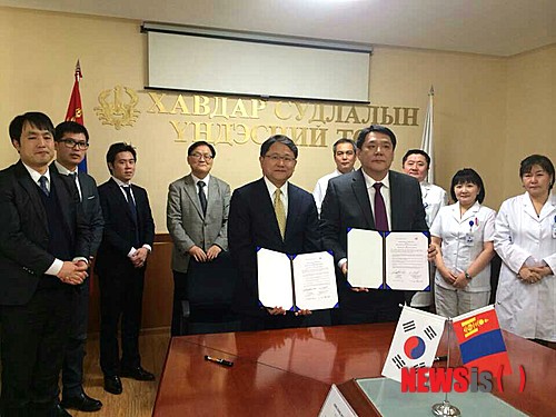 【대전=뉴시스】이시우 기자 = 지난 26일 몽골 국립암센터에서 선병원 선승훈 의료원장(사진 앞 왼쪽)과 투무르 바아타르(Tumur Baatar, 오른쪽) 몽골 국립암센터 원장이 암환자의 치료 및 의료진의 교육과 연구, 서비스 교류를 위한 양해각서를 체결했다. 2014.3.27. (사진=선병원의료재단 제공)