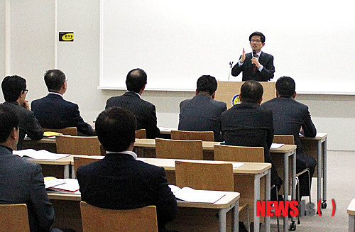【포천=뉴시스】 이종구 기자 = 김문수 경기도지사는 9일 차의과학대학교 미래관에서 열린 차의대 최고경영자과정 초청 강연에서 통일에 대한 생각을 밝히고 있다. 2014.04.09