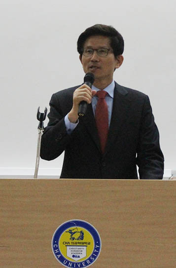 【포천=뉴시스】이종구 기자 = 김문수 경기도지사는 9일 경기 포천의 차의과학대학교 미래관에서 열린 차의대 최고경영자과정 초청 강연에서 “통일만 되면 분단으로 인해 낙후된 포천 연천 등 접경지역에 금강산과 개성, 평양, 러시아 블라디보스토크로 가는 철도와 고속도로가 집중적으로 만들어져 엄청난 발전이 있을 것”이라며 “통일이 언제 될지는 아무도 모르지만 10년이면 분면 분단의 장벽에 큰 변화가 올 것이기에 경기북부는 기회의 땅”이라고 밝혔다. 2014.04.09.