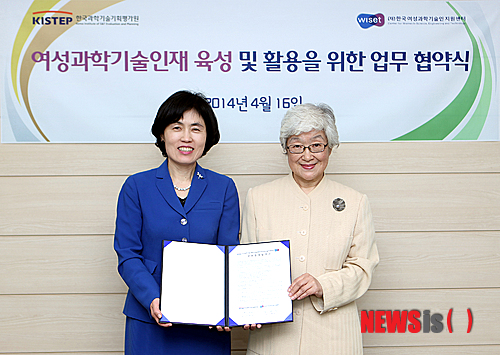 【서울=뉴시스】16일 오전 서울 양재동 한국과학기술기획평가원(KISTEP) 사옥에서 박영아(왼쪽) KISTEP 원장과 이혜숙 한국여성과학기술인지원센터(WISET) 소장이 여성과학기술인재 육성 및 활용을 위한 협약을 체결한 뒤 기념촬영을 하고 있다. 2014.04.16. (사진=한국과학기술기획평가원 제공)