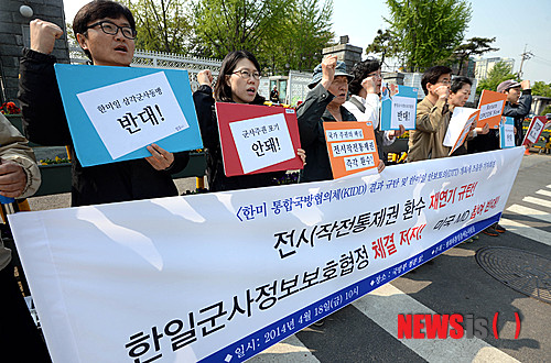 이들은 전시작전통제권 환주 재연기 규탄 및 한일군사정보보호협정 체결 저지, 미국 MD 참여 반대 등을 주장했다. 2014.04.18.