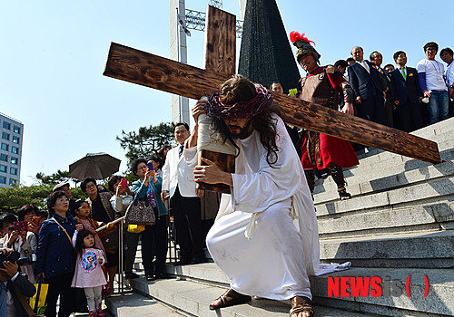 【서울=뉴시스】박동욱 기자 = 20일 오후 서울 영등포구 여의도 순복음교회에서 열린 '2014 부활절 십자가 대행진'에서 각 역할을 맡은 배우들이 십자가을 짊어지고 이동하는 예수의 모습을 재연하고 있다. 2014.04.20.