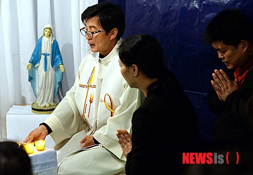 【진도=뉴시스】박영태 기자 = '세월호' 여객선 침몰사고 발생 엿새째인 21일 오후 전남 진도체육관에서 천주교 광주대교구 신부와 신자들이 실종자들의 무사귀환을 바라는 예배를 올리며 기도를 하고 있다. 2014.04.21.