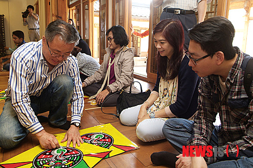 【서울=뉴시스】15일 한국 전통연문화를 배우기 위하여 세계각국 외국인들이 서울시 북촌한옥마을의 대한민국 유일 민속연 원형기법 보유자인 전통연 장인인 전통문화단체 한국연협회 리기태 회장을 찾아왔다. 리기태 회장은 서울시 종로구청 북촌전통공예체험관에서 서울시 무형문화인 연제작 및 연날리기, 연만들기를 진행하였다, 특히 아름다운 북촌한옥에서 한국전통연인 방패연, 가오리연, 창착연을 공부하고 서울시 한양도성도감의 전통문화를 알리는 계기가 되었다.