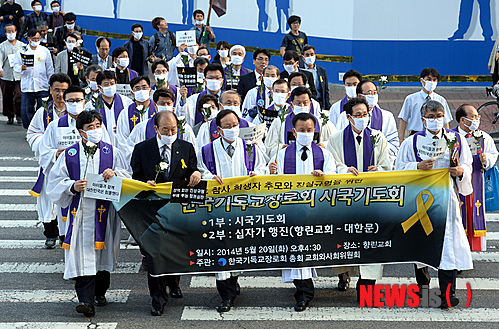 【서울=뉴시스】박상훈 기자 = 한국기독교장로회총회가 20일 오후 서울 을지로 향린교회에서 '세월호 참사 희생자 추모와 진실 규명을 위한 시국기도회'를 열고 예배를 마친 뒤 대한문을 향해 행진하고 있다. 2014.05.20.