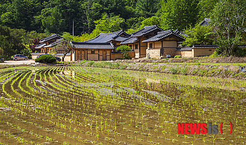 【안동=뉴시스】김진호 기자 = 경북 안동시 도산면 퇴계종택 입구의 논에 27일 모내기가 끝났다. 퇴계종택(경상북도 기념물 제42호) 입구 논은 봄과 여름이면 녹색, 가을에는 황금빛, 겨울이면 순백의 눈으로 덮혀 종택을 더욱 아름답게 꾸며준다. 2014.05.28 (사진= 안동시 제공)