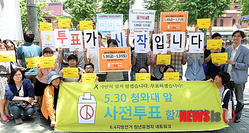 【서울=뉴시스】고범준 기자 = 6·4 전국동시지방선거 사전투표가 실시된 30일 오후 서울 청운효자동 주민센터 인근에서 청년유권자 네트워크 회원들이 사전투표참여 독려 캠페인을 벌이고 있다. 2014.05.30.