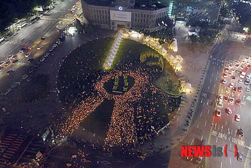 【서울=뉴시스】박찬수 기자 = 31일 오후 서울 중구 태평로 서울광장에서 '세월호 추모 범국민 촛불행동' 참가자들이 세월호 희생자들을 추모하는 '촛불리본'을 만들고 있다. 2014.05.31.