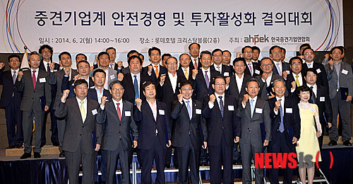 【서울=뉴시스】김진아 기자 = 2일 오후 서울 중구 롯데호텔 에메랄드룸에서 열린 한국중견기업연합회 주최 '중견기업계 안전경영 및 투자활성화 결의대회'에서 윤상직 산업통상자원부 장관과 강호갑 중경련 회장을 비롯한 중견기업 대표들이 기념촬영을 하고 있다.