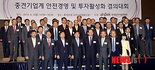 【서울=뉴시스】김진아 기자 = 2일 오후 서울 중구 롯데호텔 에메랄드룸에서 열린 한국중견기업연합회 주최 '중견기업계 안전경영 및 투자활성화 결의대회'에서 윤상직 산업통상자원부 장관과 강호갑 중경련 회장을 비롯한 중견기업 대표들이 기념촬영을 하고 있다.