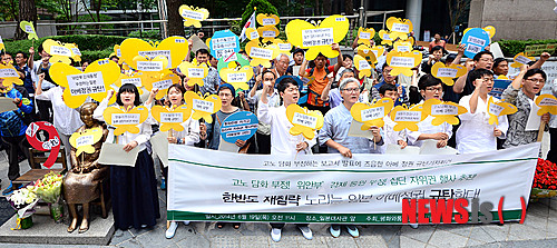 이들은 "일본군 위안부 강제 동원의 강제성을 처음으로 인정했던 고노 담화를 부정하고 집단 자위권 행사를 추진하는 아베 정부를 규탄한다"고 주장했다. 2014.06.19.