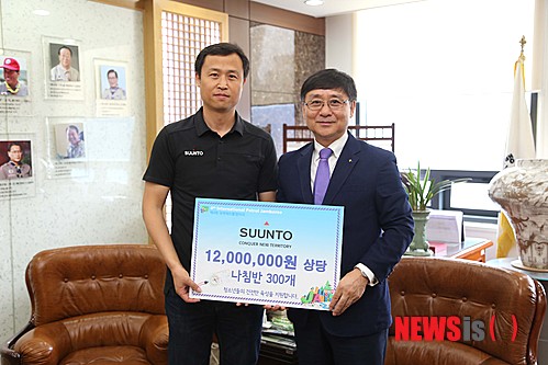 【서울=뉴시스】25일 서울 영등포구 한국스카우트연맹 회관에서 김묘연(왼쪽) 아머스포츠코리아 부장이 한국스카우트연맹 김기덕 사무총장에게 제4회 국제패트롤잼버리의 성공적인 개최와 바람직한 청소년 육성 지원 물품을 전달한 뒤 기념촬영을 하고 있다. 2014.06.25. (사진=한국스카우트연맹 제공)