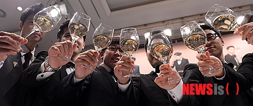 【서울=뉴시스】김인철 기자 = 8일 오전 서울 강남구 논현동 임피리얼 팰리스 호텔에서 프랑스 농업식품산림부(MAAF)가 주최하고 소펙사 코리아(SOPEXA KOREA)가 주관하는 제13회 한국 소믈리에 대회에서 결선에 진출한 참가자들이 와인을 들고 포즈를 취하고 있다. 2014.07.08.
