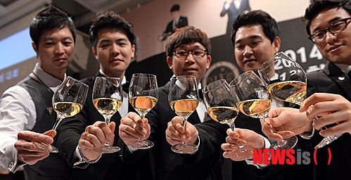 【서울=뉴시스】김인철 기자 = 8일 오전 서울 강남구 논현동 임피리얼 팰리스 호텔에서 프랑스 농업식품산림부(MAAF)가 주최하고 소펙사 코리아(SOPEXA KOREA)가 주관하는 제13회 한국 소믈리에 대회에서 결선에 진출한 참가자들이 와인을 들고 포즈를 취하고 있다. 2014.07.08.