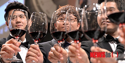 【서울=뉴시스】김인철 기자 = 8일 오전 서울 강남구 논현동 임피리얼 팰리스 호텔에서 프랑스 농업식품산림부(MAAF)가 주최하고 소펙사 코리아(SOPEXA KOREA)가 주관하는 제13회 한국 소믈리에 대회에서 결선에 진출한 참가자들이 와인을 들고 포즈를 취하고 있다. 2014.07.08.