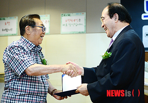 【서울=뉴시스】박문호 기자 = 방송인 송해가 8일 오후 서울 종로구 새문안로3길 경희궁의아침 교보문고 문화이벤트홀에서 도전한국인운동본부 주최로 열린 제2회 도전의 날 도전페스티벌 및 최고기록인증 행사에서 김용진 대한민국 최고기록 인증원 원장으로부터 전국노래자랑 35년 최장 국민MC를 지낸 기록으로 대한민국최고기록 인증서를 받고 있다.