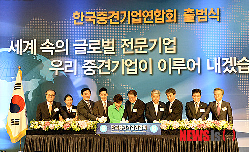 【서울=뉴시스】홍찬선 기자 = 박근혜 대통령이 22일 오후 서울 중구 소공동 롯데호텔에서 열린 한국중견기업연합회 출범식에 참석해 강호갑 한국중견기업연합회장을 비롯한 인사들과 축하떡을 자르고 있다. 왼쪽부터 한정화 중소기업청장, 수원전산여고 여소희 학생, 최경환 기획재정부 장관, 한성훈 태양금속공업 사장, 박 대통령, 강 중견기업연합회장, 김동철 새정치민주연합 의원, 장병갑 미림여자정보과학고 교장, 윤상직 산업통상자원부 장관, 최진식 SIMPAC 회장. 2014.07.22.