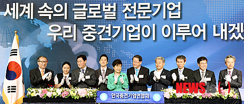 【서울=뉴시스】홍찬선 기자 = 박근혜 대통령이 22일 오후 서울 중구 소공동 롯데호텔에서 열린 한국중견기업연합회 출범식에 참석해 강호갑 한국중견기업연합회장을 비롯한 인사들과 축하떡을 자르며 박수를 치고 있다. 왼쪽부터 한정화 중소기업청장, 수원전산여고 여소희 학생, 최경환 기획재정부 장관, 한성훈 태양금속공업 사장, 박 대통령, 강 중견기업연합회장, 김동철 새정치민주연합 의원, 장병갑 미림여자정보과학고 교장, 윤상직 산업통상자원부 장관, 최진식 SIMPAC 회장. 2014.07.22.