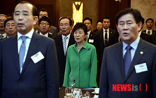 【서울=뉴시스】홍찬선 기자 = 박근혜 대통령이 22일 오후 서울 중구 소공동 롯데호텔에서 열린 한국중견기업연합회 출범식에 참석해 인사들과 애국가 제창을 하고 있다. 2014.07.22.
