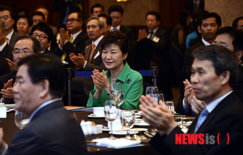 【서울=뉴시스】홍찬선 기자 = 박근혜 대통령이 22일 오후 서울 중구 소공동 롯데호텔에서 열린 한국중견기업연합회 출범식에 참석해 인사들과 최경환 기획재정부 장관을 비롯한 인사들과 박수를 치고 있다. 2014.07.22.