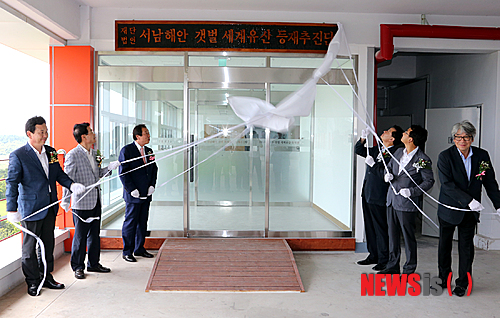 【신안=뉴시스】박상수 기자 = 30일 전남 신안군청에서 서남해안 갯벌 세계유산 등재추진단 사무국 개소식이 열리고 있다. 추진단 사무국은 충남 서천군 유부도와 신안군 다도해 지역 등 서남해안 갯벌의 세계유산 등록을 추진한다. 2014,07,30 (사진=신안군 제공)