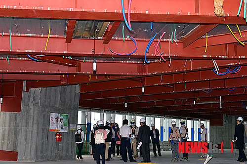【서울=뉴시스】강진형 기자 = 6일 오전 서울 송파구 제2롯데월드타워 건설현장에서 열린 출입기자 현장방문에서 월드타워동 49층 공사 현장이 공개되고 있다. 2014.08.06.