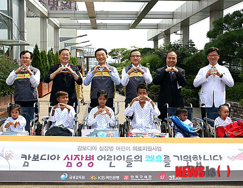 자선냄비본부 이수근 사무총장, 리티폴 주한 캄보디아대사관 상무관과 함께 경기도 부천 세종병원을 방문해 '캄보디아 심장병 어린이 의료지원' 사업을 통해 국내에서 수술을 마치고 회복중인 캄보디아 어린이들을 격려한 뒤 기념촬영을 하고 있다. 2014.08.12. (사진=KB국민은행 제공)