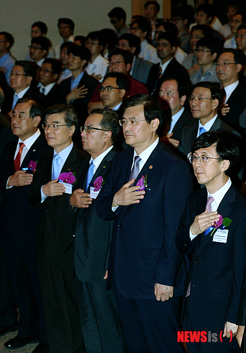 【서울=뉴시스】박문호 기자 = 25일 오전 서울 강남구 영동대로 코엑스에서 열린 ‘2014스마트국토엑스포’ 개막식에서 서승환 교통부 장관과 참석자들이 국민의례를 하고 있다.