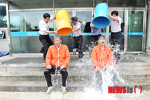 【문경=뉴시스】김진호 기자 = 이응천(왼쪽) 경북 문경시의회 의장과 박영서 경북도의원이 29일 아이스버킷 챌린지에 동참해 문경시의회 청사앞에서 얼음물을 맞고 있다. 2014.08.29 (사진= 문경시의회 제공)