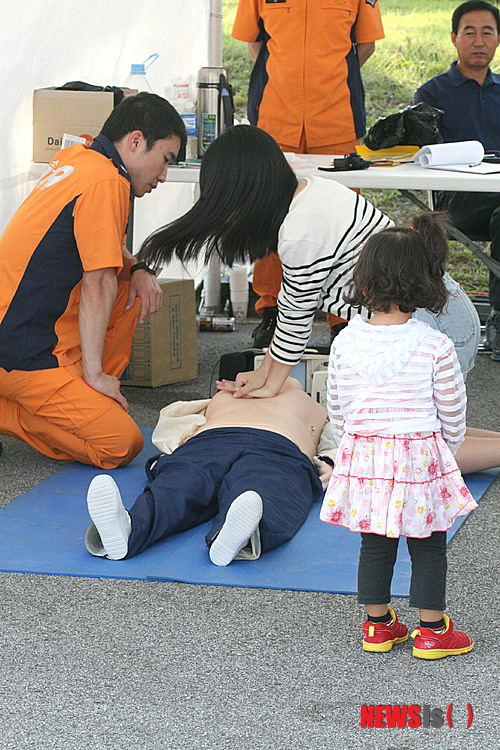 【춘천=뉴시스】박혜미 기자 = 31일 대회 3일째를 맞은 춘천국제레저대회장에서 춘천소방서가 관람객들을 대상으로 '심폐소생술(CPR)'에 대한 필요성을 전하기 위해 직접 체험할 수 있는 자리를 만들어 교육하고 있다. 2014.08.31.