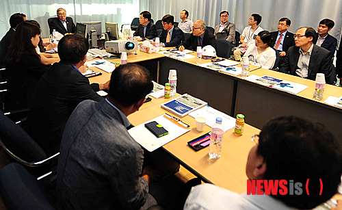 【서울=뉴시스】조수정 기자 = 4일 광주를 방문한 김종덕 문화체육관광부 장관이 오는 10월 완공 예정인 광주광역시 금남로 국립아시아문화전당 건립 현장을 방문해 김성일 아시아문화중심도시추진단장 등 관계자들로부터 진행 사항을 보고 받고 뒤에 마무리말을 하고 있다. 2014.09.04.(사진=문화체육관광부 제공)