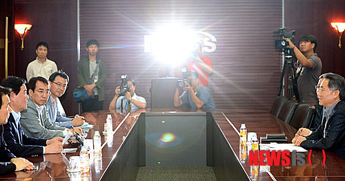 【서울=뉴시스】서재훈 기자 = 최경환 경제부총리 겸 기획재정부 장관(왼쪽)이 10일 오후 경기도 판교에 위치한 소프트웨어(SW)기업 마이다스아이티를 방문해 이형우 대표이사(오른쪽)와 함께 이야기를 나누고 있다.