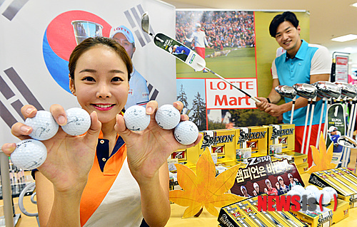 【서울=뉴시스】강진형 기자 = 18일 오전 서울 송파구 롯데마트 잠실점에서 모델들이 LPGA 에비앙 챔피언십에서 우승을 차지한 김효주 선수가 사용하는 골프 클럽을 비롯한 다양한 골프용품과 사인을 넣은 한정판 골프공을 선보이고 있다. 2014.09.18.