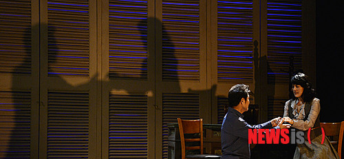 【서울=뉴시스】홍찬선 기자 = '에쿠우스' '아마데우스'로 유명한 영국 작가 피터 셰퍼의 또 다른 대표작 연극 '고곤의 선물' 프레스 리허설이 열린 18일 오후 서울 종로구 세종문화회관 M씨어터에서 박상원(에드워드 담슨 역), 김소희(헬렌 담슨 역)가 열연을 하고 있다. 2014.09.18.
