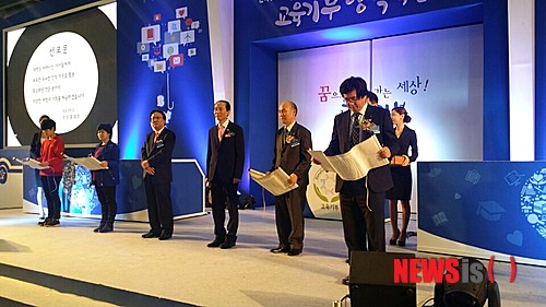 【포항=뉴시스】강진구 기자 = 경북 포항의 한동대학교 장순흥 총장이 18일 오후 경기도 일산 킨텍스(KINTEX)에서 열린 ‘2014 제3회 대한민국 교육기부 행복박람회’ 개막식에 참석해 대학 대표로 교육기부 선포문을 낭독했다. 이번 박람회는 교육부가 주최하고 한국과학창의재단이 주관하며 ‘2014 방과후 학교·돌봄교실 박람회’와 동시에 개최된다.2014.09.19. (사진=한동대학교 제공)
